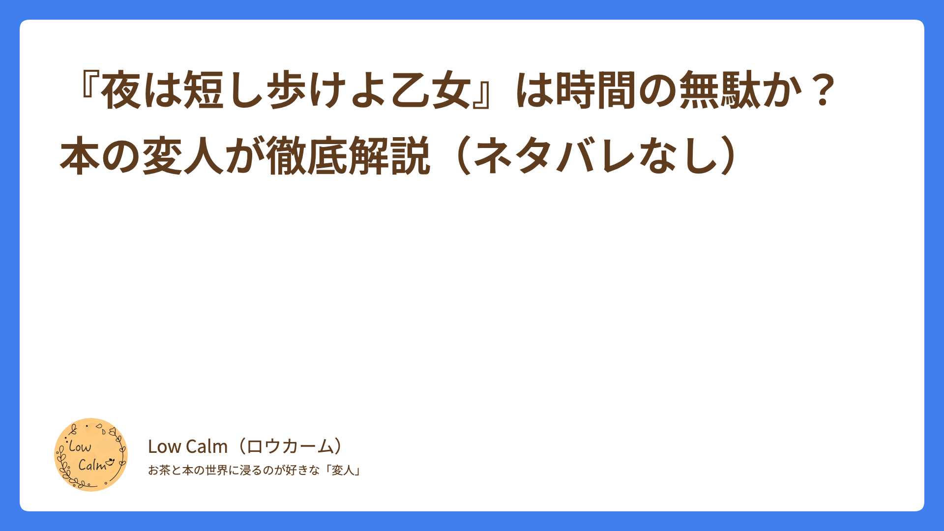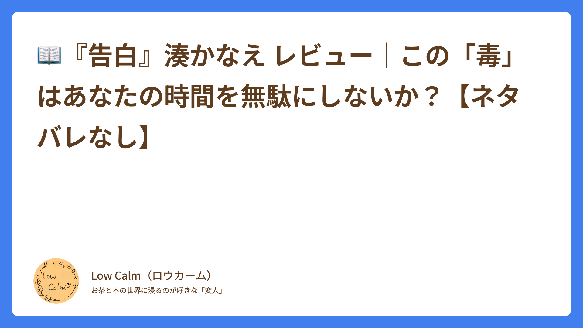 • 筆者は、自称「本の変人」Low calm(ロウカーム):純文学、ミステリ、ビジネス書など年間100冊以上を読破し、**「あなたの時間を大切にする」**良書だけを厳選して紹介しています。