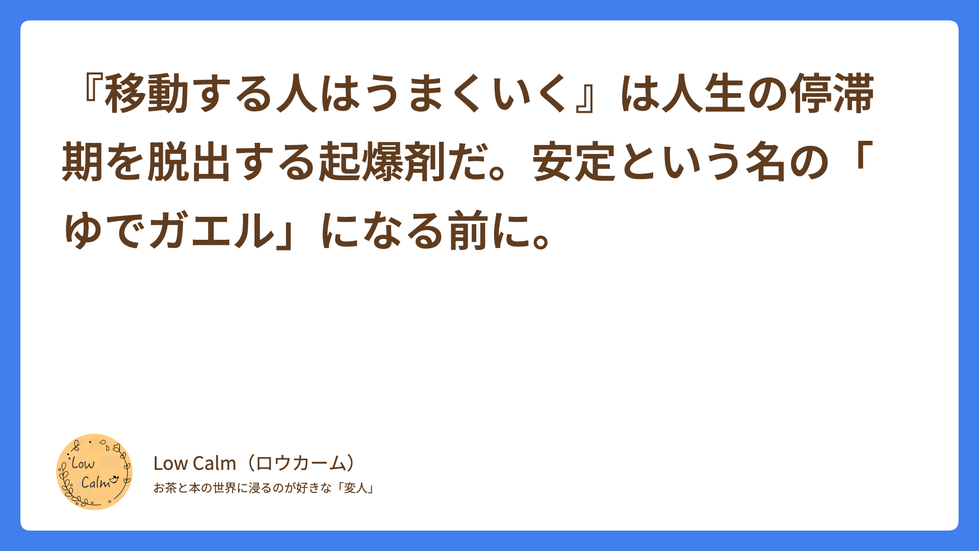『移動する人はうまくいく』は人生の停滞期を脱出する起爆剤だ。安定という名の「ゆでガエル」になる前に。 2025.11.21 ノンフィクション Low Calm 【時間を無駄にしない おすすめ本紹介】 Low Calm