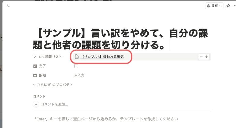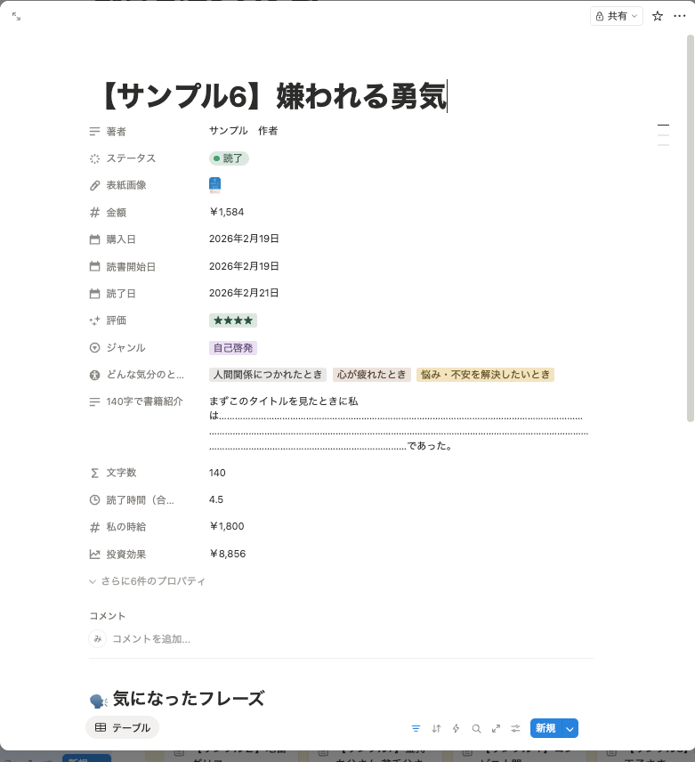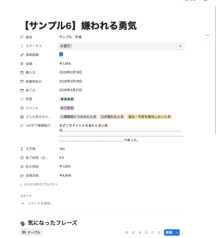 上下ともに、”【サンプル6】嫌われる勇気”の入力画面