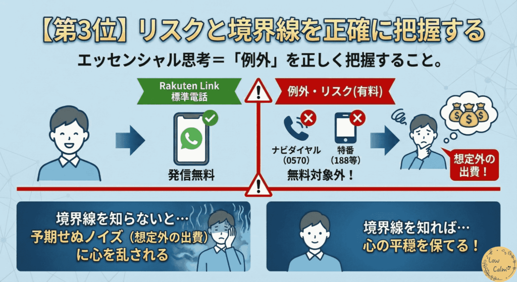 例えば、楽天モバイルのRakuten Link。標準電話への発信は無料だが、ナビダイヤル(0570)や特番(188等)は無料対象外となる。