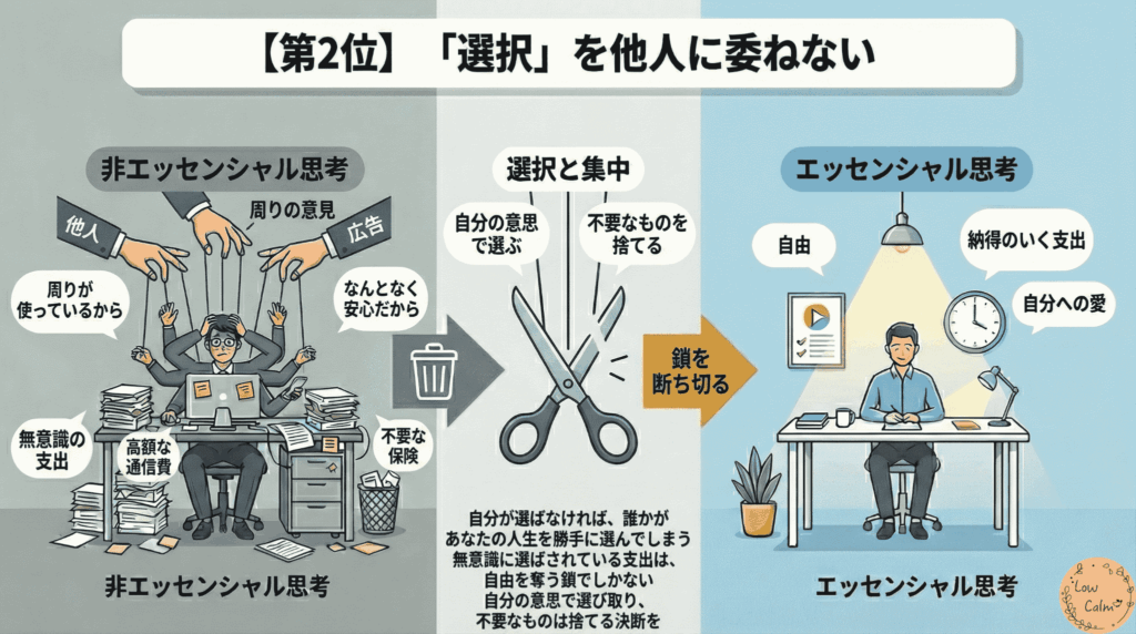 もし自分が選ばなければ、誰かがあなたの人生を勝手に選んでしまう。この言葉は、FPとして家計相談に乗る際にも痛感する。 「周りが使っているから」「なんとなく安心だから」という理由で、高額な通信費や保険料を支払い続けていないだろうか。 無意識に選ばされている支出は、あなたの自由を奪う鎖でしかない。自分の意思で選び取り、不要なものは捨てる。その決断こそが、自分を愛することに繋がる。