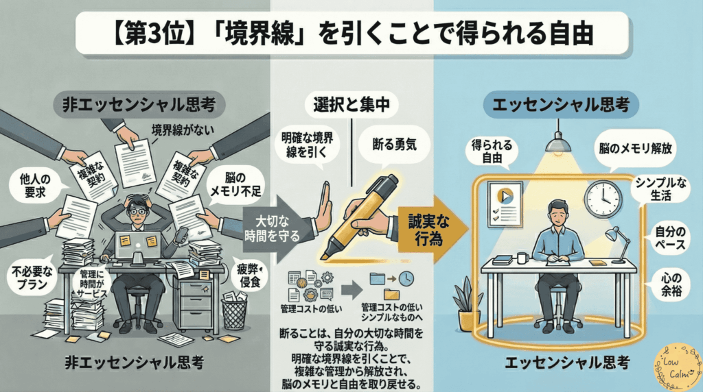 断ることは、不誠実ではない。むしろ、自分の大切な時間を守るための誠実な行為だ。 私は寛解期にあるとはいえ、体力を過信できない。だからこそ、仕事でもプライベートでも明確な「境界線」を引くようにしている。 不必要なプラン、複雑すぎる契約、管理に時間がかかるサービス。これらを「管理コストの低いシンプルなもの」に置き換えることは、脳のメモリを解放するための最も合理的な手段だ。
