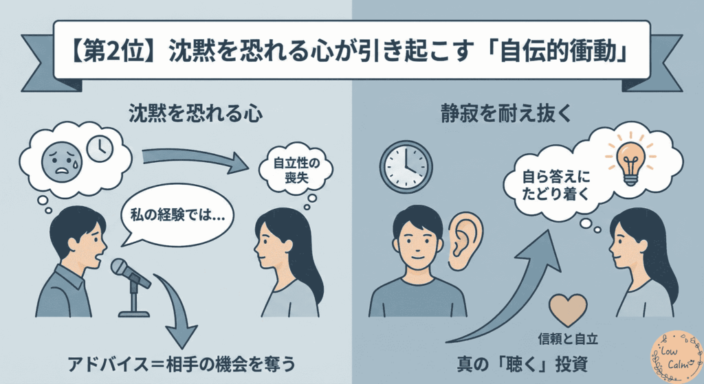 自伝的衝動(Biographical urge)と呼び、厳しく戒めています。 アドバイスは一見親切ですが、相手が自ら答えにたどり着く機会を奪ってしまいます。話を奪うことは、相手の自立性を損なう行為だと言わざるを得ません。 難病で療養していた頃、私が求めていたのは解決策ではなく、ただ隣で私の言葉を待ってくれる人の存在でした。その静寂を耐え抜くことこそが、真の「聴く」という投資なのです。