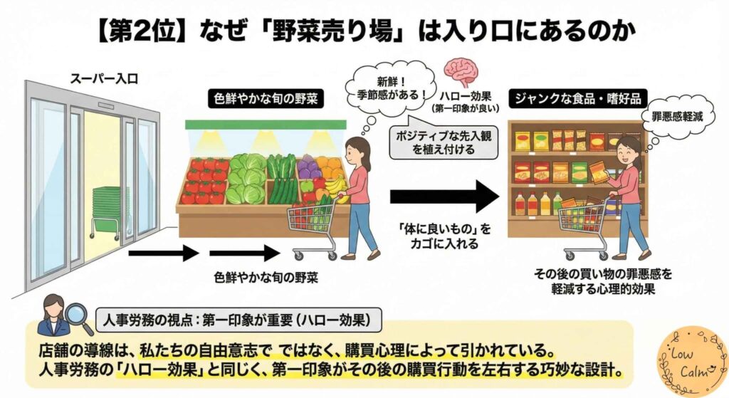 さらに、最初に野菜という「体に良いもの」をカゴに入れることで、その後のジャンクな食品や嗜好品を買う罪悪感を軽減させるという心理的効果まで計算されています。