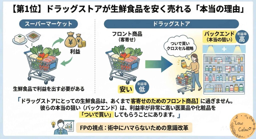 FPの視点から言えば、これは一種のクロスセル戦略です。 「卵が安いから」と店に入り、結果として予定になかった千円以上のサプリメントや洗剤をカゴに入れてしまう。
