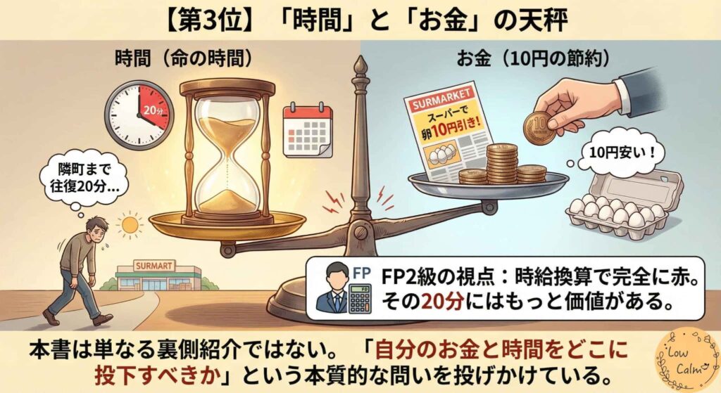 本書を読み進めるうちに「10円安い卵を求めて、隣町のスーパーまで20分かけて行くこと」の合理性に疑問符がつきます。