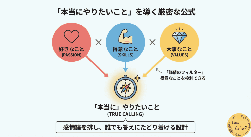 「好きなこと」「得意なこと」「大事なこと」を組み合わせ、自分だけの指針を導き出す数学的な公式。 - Low calmの判定
